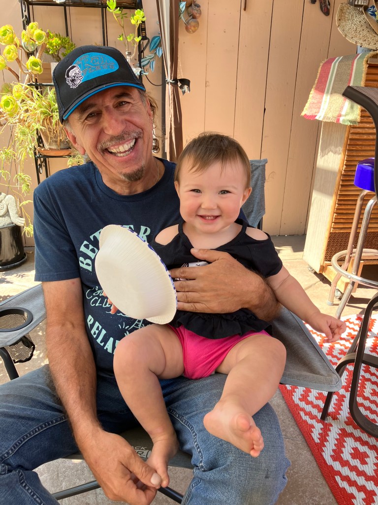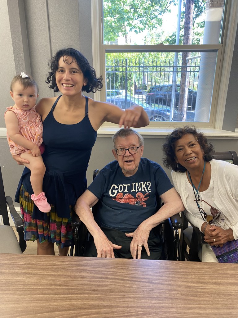 With Great Grandpa. She wore her bow so he could see that she wasn’t a “big boy”.